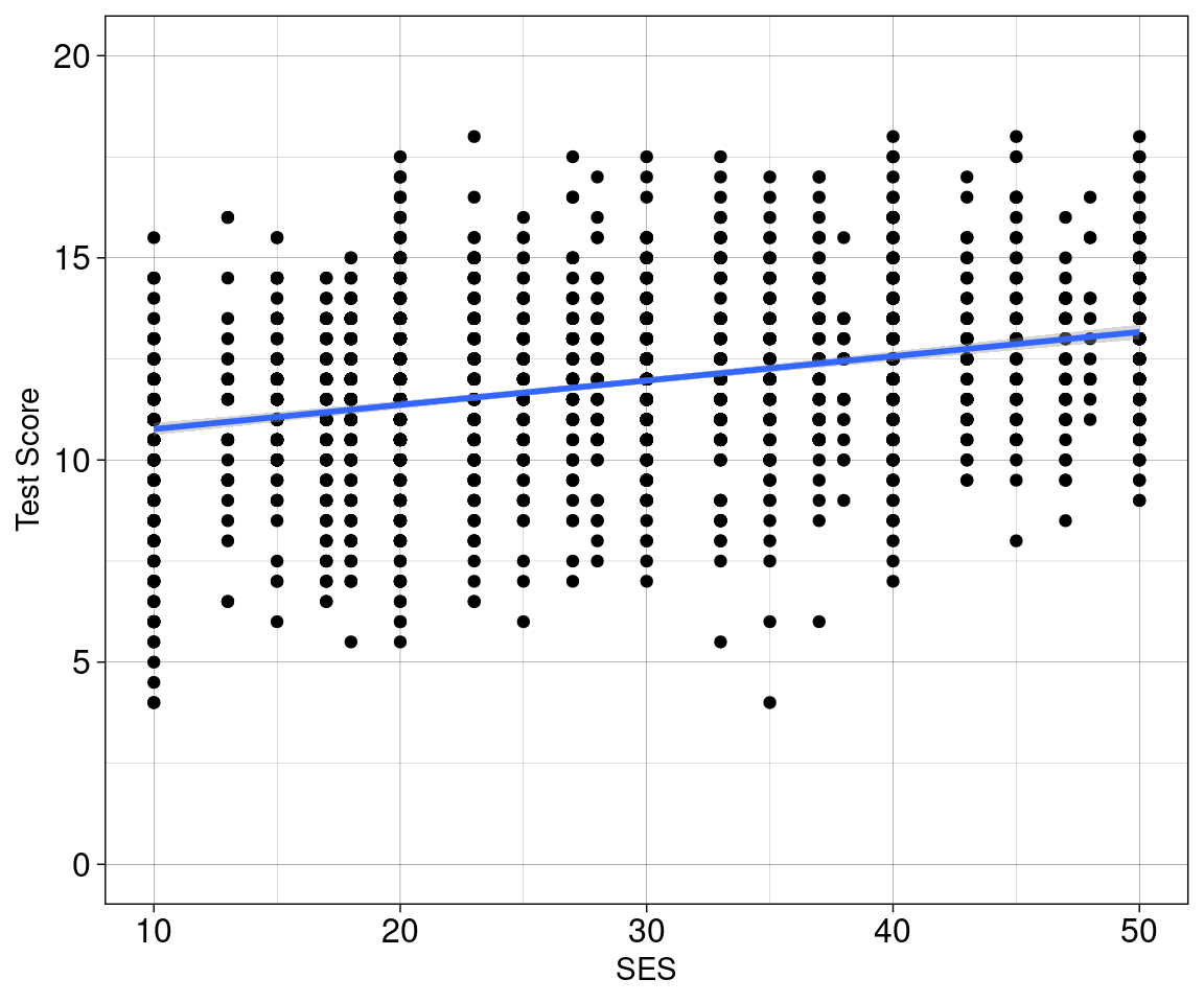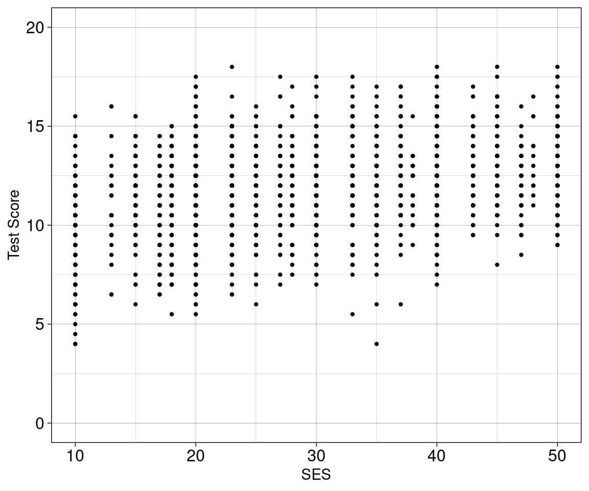 Soziökonomischer Status (SES) von Schüler:innen (\(X\)) wirkt sich auf die Perfomanz (Test Score) der Schüler:innen in einem Test (\(Y\)).