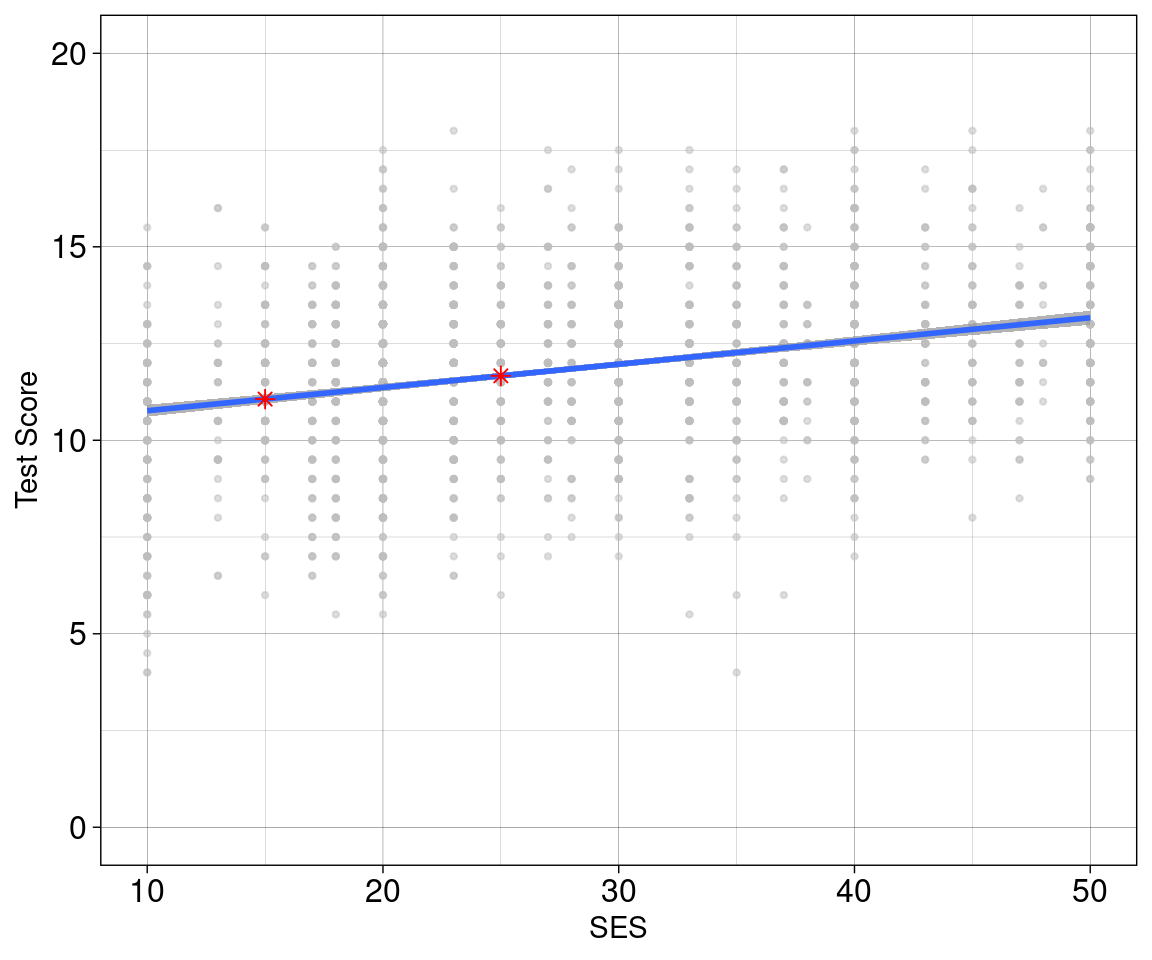 Der effekt vom Prädiktor \(X\) (AKA - Die Steigung der Regressionsgerade) \(\beta_{1}\) kann folgendermaßen vertanden werden: - Wenn SES um eine Einheit steigt (also von 0 zu 1), steigt die Performanz (im Mittel) um das \(\beta_{1}\)-fache.